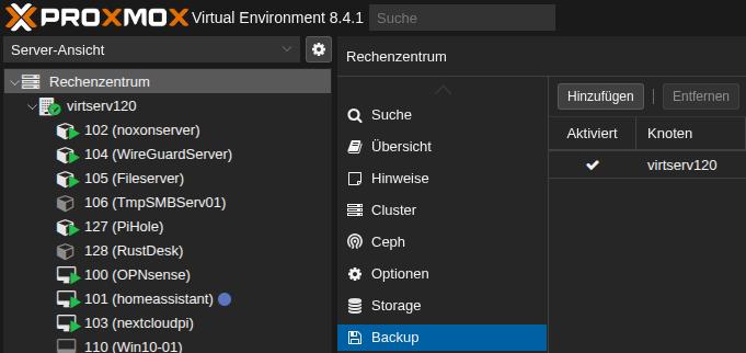 Auf dem Proxmox Server ganz oben unter Datacenter – Backup sind die Jobs definiert.